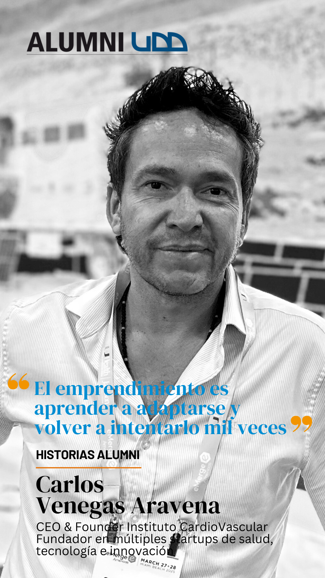 Carlos Venegas Aravena, Ingeniero Civil Industrial de la Universidad del Desarrollo, complementó su formación con un Master of Science in Transport and Maritime Management en la Universidad de Amberes, Bélgica. Ha construido una destacada trayectoria como creador de startups en los ámbitos de la salud, la tecnología y la innovación. Su experiencia combina visión estratégica y resiliencia. Tiene una vinculación permanente con la Universidad del Desarrollo, donde hoy es parte de ReUDD, Red de Emprendedores Alumni de la Universidad.
